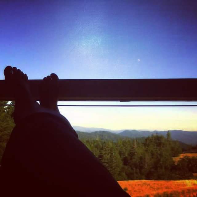 Sitting on the porch of my aunt’s house in northern California. Reading a book. Enjoying everything the surroundings had to offer. But this is a setting where I’m most content. So there must be something in it that expresses who I am. My “happy place” is lying in the little bed at the cabin, overlooking the lake, with a book. Drifting between reading and napping and watching the critters outside.